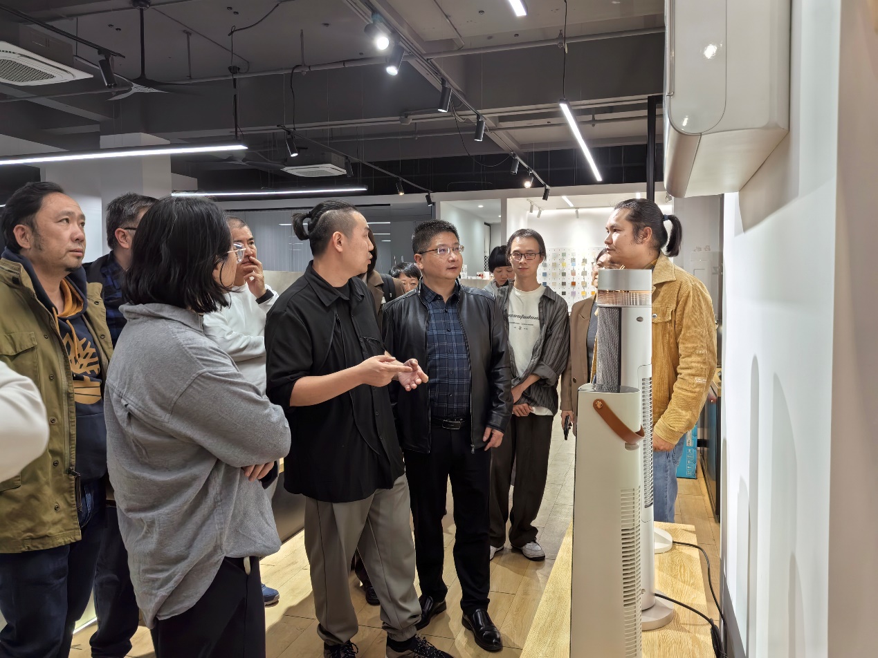 随后,在专委会副主任、佛山市三人一物工业设计有限公司经理、2006级工业设计专业潘伟校友的安排下,代宁一行先后参观了广东工业设计城创新科技馆与三人一物公司。展厅参观环节,讲解员对设计城创新科技馆展厅进行介绍、带领团队参观各类高新设计产品;企业调研环节,潘伟校友详细介绍了服务美的、松下等品牌的设计实践,学院领导对校友企业的创新成果予以高度肯定,并与校友企业达成“人才实习+项目共创”的初步合作意向。