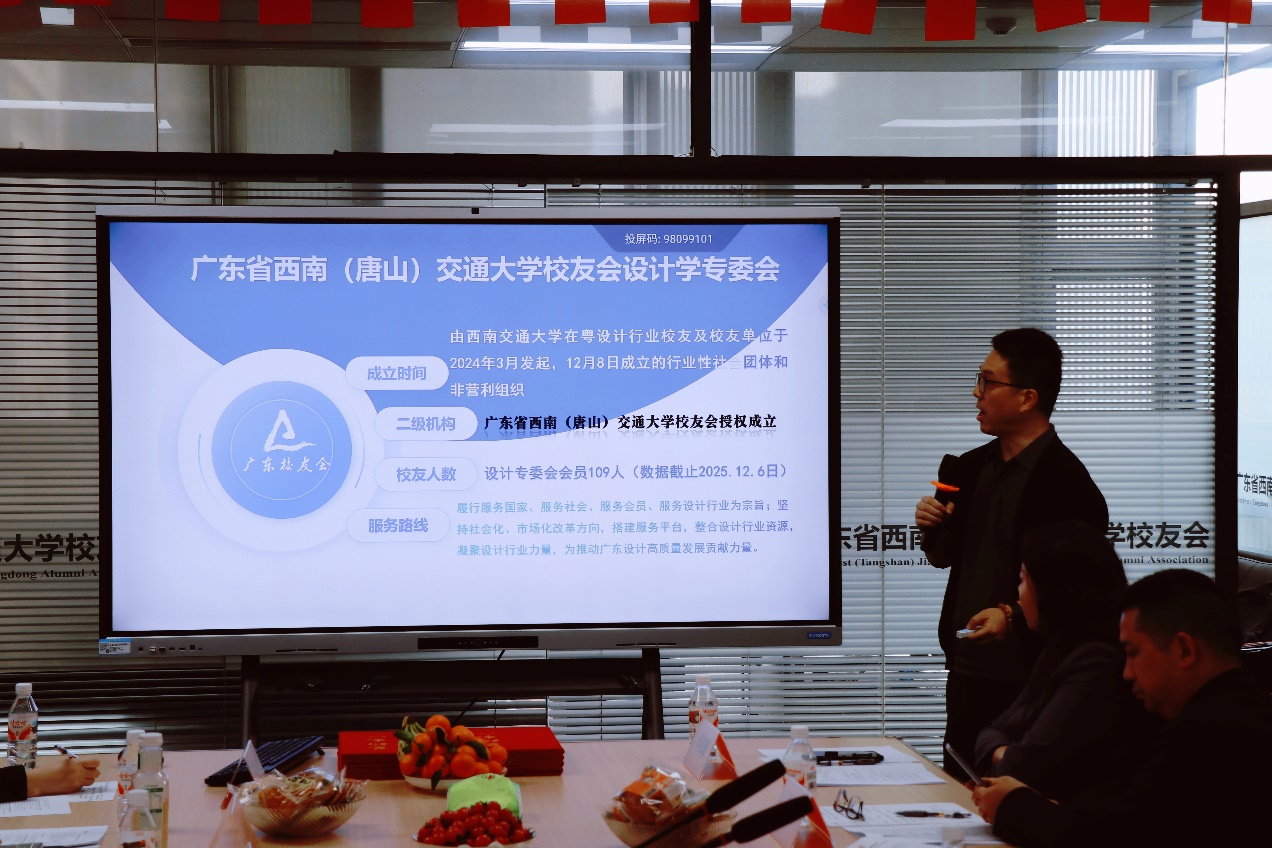 广东省西南(唐山)交通大学校友会秘书长唐浩明介绍了广东省校友会组织架构与发展成果;设计学专委会主任张峥汇报了专委会基本情况,包括会员构成、组织框架、过往活动及平台服务成果,明确未来将聚焦平台建设、人才孵化与校企合作的核心方向。