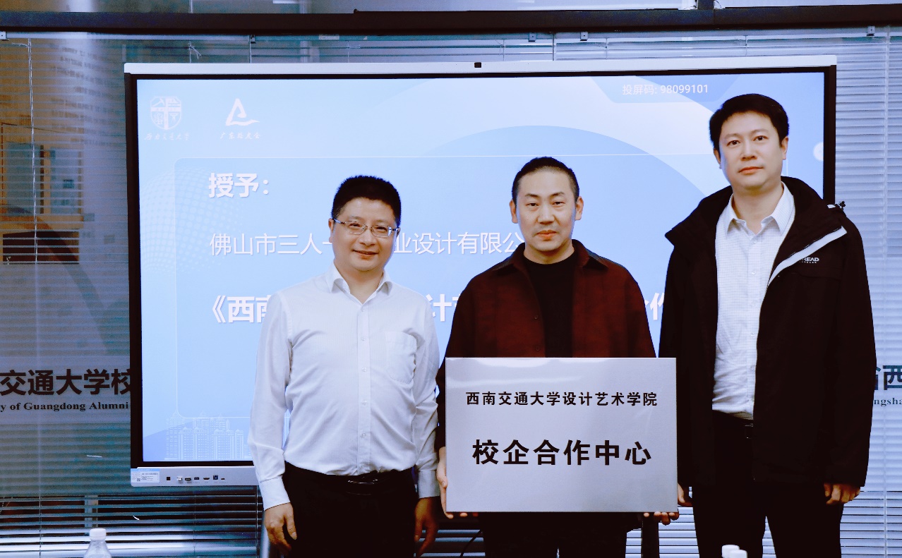 随后,举行院级合作中心授匾仪式。代宁、赵煜共同为合作单位授匾:授予广东省西南(唐山)交通大学校友会设计学专委会“西南交通大学设计艺术学院人才孵化基地”,助力校友与在校学子的成长发展衔接;授予佛山市三人一物工业设计有限公司“西南交通大学设计艺术学院校企合作中心”,深化企业与学院的产学研协同。