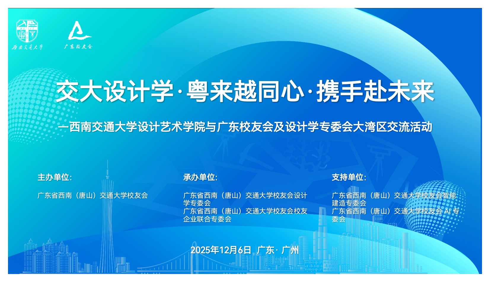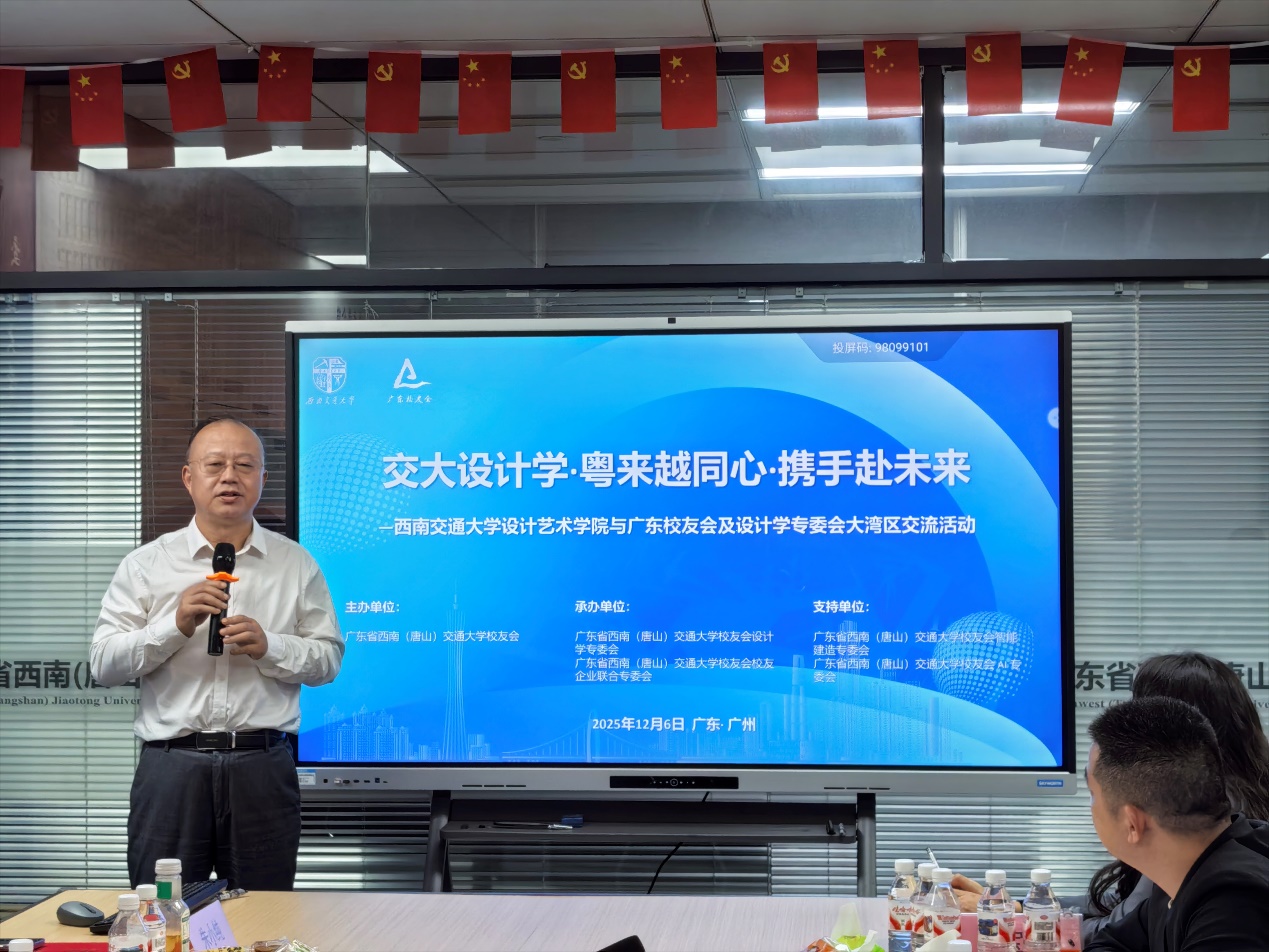 2025年12月6日,以“交大设计学・粤来越同心・携手赴未来”为主题的西南交通大学设计艺术学院与广东省校友会及设计学专委会大湾区交流活动,在广州市富力新天地中心校友办公室顺利召开。设计艺术学院党委书记代宁、党委副书记赵煜,以及学院系室负责人、辅导员代表参会。