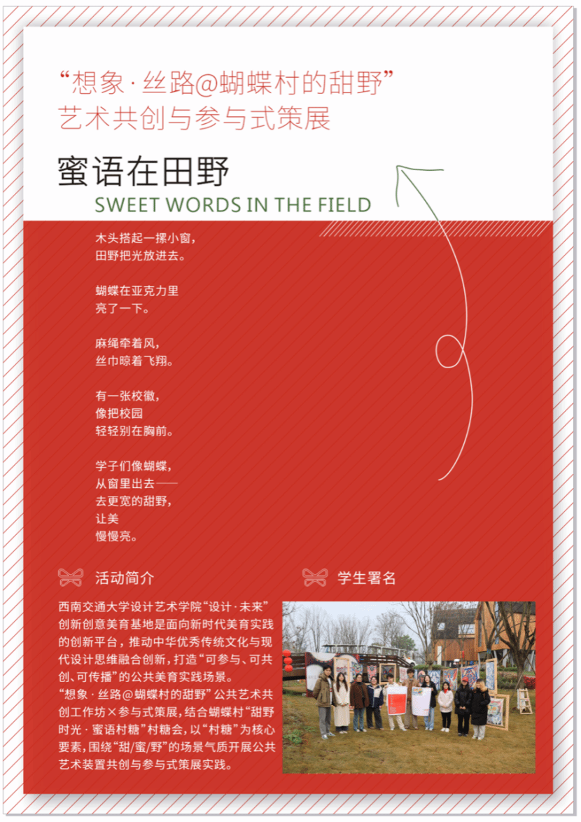 “校园里的创意”走向“乡村的真实现场”,美育就不再只是课堂里的审美训练,而是一次与土地、公众与生活同频共振的共同创作。依托西南交通大学设计艺术学院“设计·未来”创新创意美育基地长期构建的“可参与、可共创、可传播”的公共美育实践场景,我们与郫都区蝴蝶村“村糖会”相遇,让装置在节庆人流中“发生”,让策展在公共空间里“被看见”。
