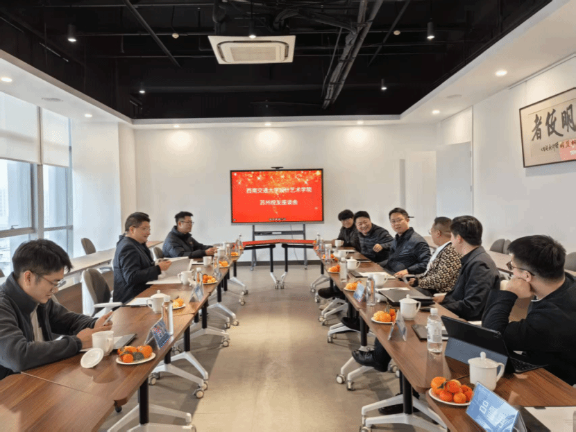 随后,调研组与在苏州的设计校友及兄弟院校代表举行了深入的座谈交流。苏州城市学院艺术与创意设计学院副书记丁良超以及张海良、缪炜、卢晓晖、谢康、吴飞超等校友参加座谈。代宁书记向校友们介绍了学院近年来的发展成就,大家就校企合作模式创新及校友资源整合等话题展开了热烈讨论,为进一步搭建校企合作平台、促进校友与母院共同发展奠定了基础。