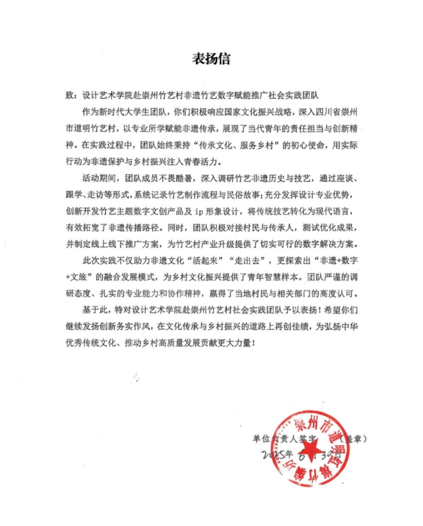 此次实践中,队员们以身体验、以心传承、以智创新,不仅深化了对非遗文化价值的理解,更以专业实践响应文化振兴的时代号召。他们以青年之眼发掘传统之美,以数字之翼助力非遗翱翔——古老竹艺,正于新时代中谱写“竹艺新篇”;青春力量,亦在绿水青山间写下无限可能。