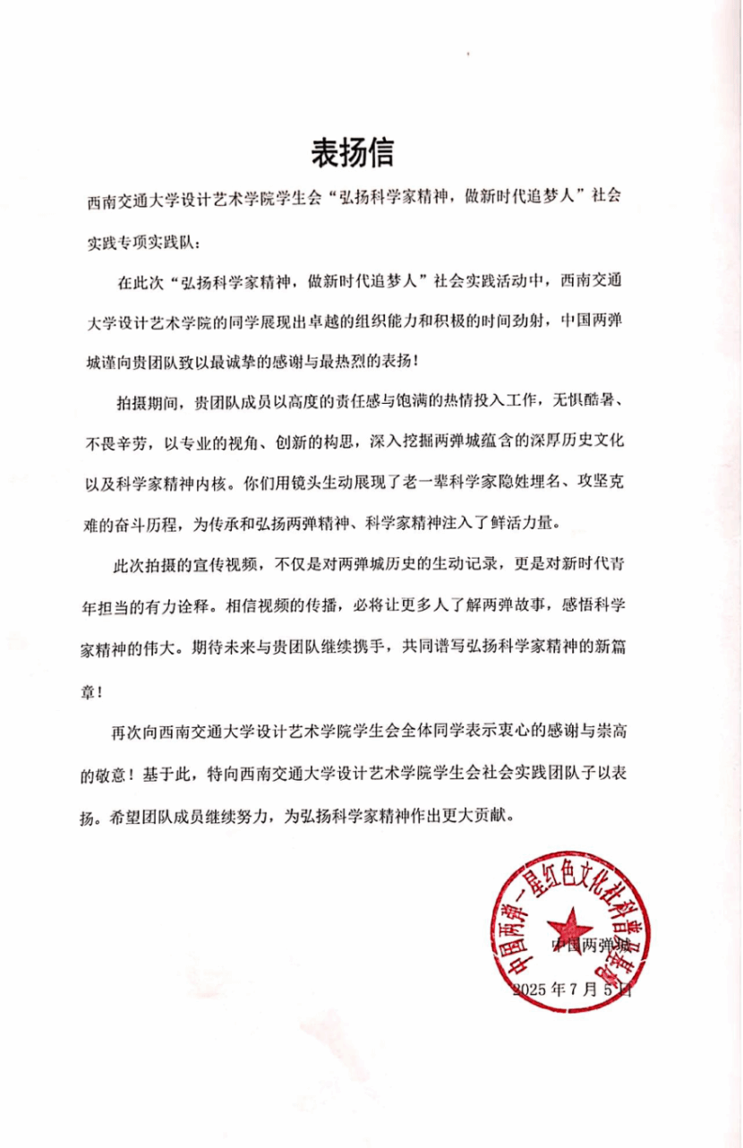 在此期间,团队成员严格遵守规定,无安全问题发生,确保了活动的顺利进行,并收到了当地的表扬信,体现了西南交通大学设计艺术学院学生会团队在助力宣传“两弹一星”精神传承与发扬做出的卓越贡献。