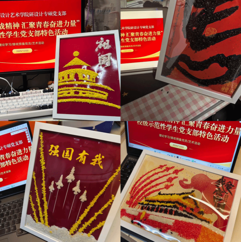 接着,党员们以“家国情怀”为主题,充分发挥专业创意,开展豆子画、纸雕灯制作活动。以历史场景、国旗、长城等为创作元素,通过构思、排版、粘贴等步骤,将一颗颗小小的豆子转化为一幅幅承载着爱国情感的艺术作品;将红色故事、时代风貌融入纸雕设计中,当灯光透过层层纸雕亮起,温暖的光芒与鲜活的图案相映成趣,成为传承红色文化的独特载体。