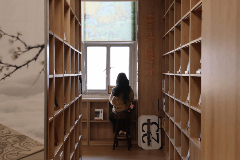 暖木色的书架圈出一方安静角落,女孩背对着镜头,把自己埋进书页与光影里。墙上“書是·遠方”几个字,像在说:不必奔赴山海,翻开书,窗外的留白与案头的墨香,早把世界铺在了手边。