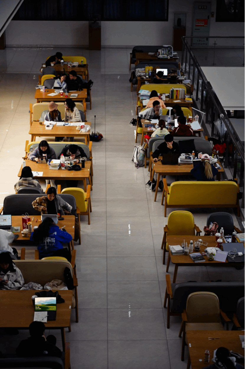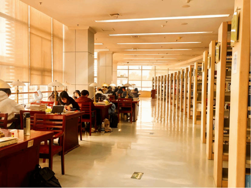 图书馆内,多组书桌错落分布,人们或专注于电脑屏幕,或埋头于纸笔之间,以不同的姿态沉浸于知识的探索,每一个身影都凝聚着对学习的热忱,构成一幅生动的求知群像。