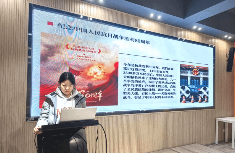 活动第一阶段,支部围绕“弘扬伟大抗战精神,汇聚青春奋进力量”开展专题理论学习。支部委员刘景飒同志带领全体党员回顾抗战峥嵘岁月,通过精读党史文献、讲述英雄故事,深入阐释了以“爱国情怀、民族气节、英雄气概、必胜信念”为核心的抗战精神。在交流研讨环节,党员们结合专业特色与时代使命,踊跃探讨“新时代如何传承抗战精神”“怎样将红色基因融入艺术创作”,在思想碰撞中进一步坚定了理想信念,强化了使命担当。