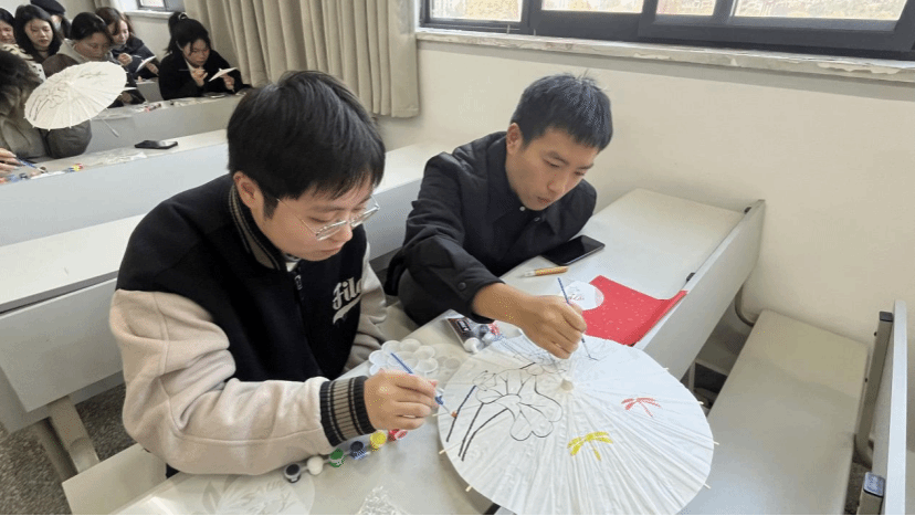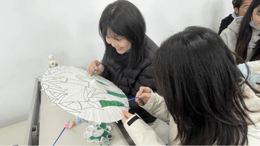 在绘制过程中,党员们结合专业特长,从构图到上色细致投入,相互交流创作理念与学习心得,将爱党爱国之情融于笔端。现场气氛热烈,一把把素色油纸伞逐渐转变为融合思想性与艺术性的主题作品。